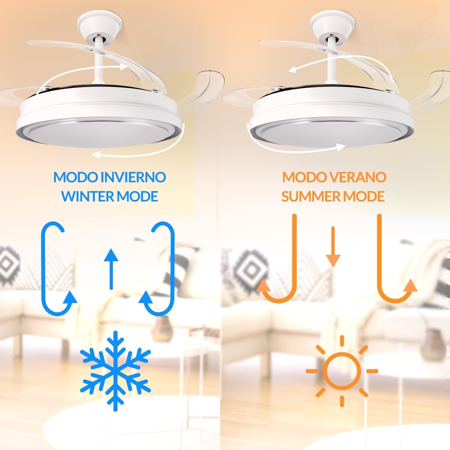 Features retractable blades that expand when in use and fold away when idle for a sleek look. The dual summer-winter function optimizes air circulation year-round, keeping spaces cool in hot weather and distributing warm air in colder months.