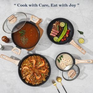 • Safe, Non-Toxic Cookware You Can Trust – Designed for healthier, worry-free cooking. Crafted with a durable granite non-stick coating free from harmful chemicals like PFOS, PFOA, lead, and cadmium, this pots and pans set ensures your meals are as clean and wholesome as the ingredients you use.